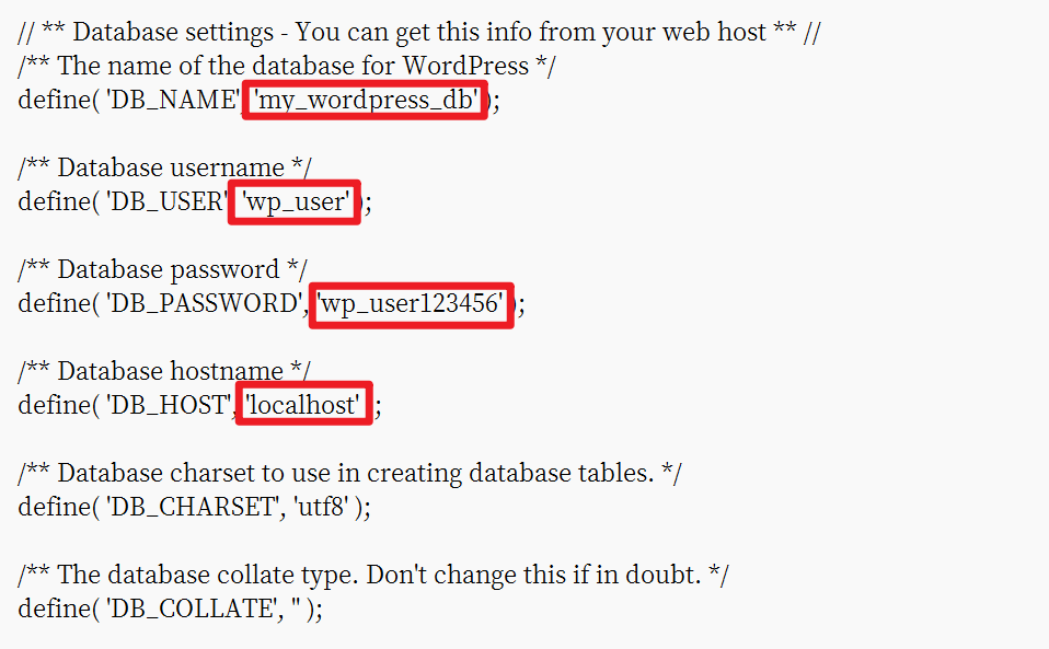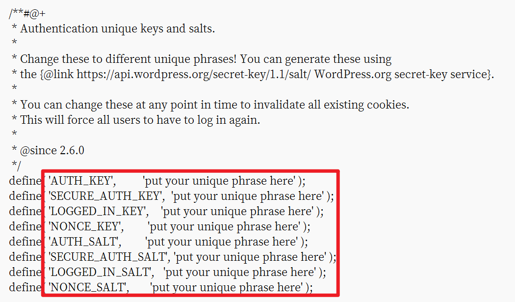 - 访问WordPress.org的密钥服务生成一组唯一的密钥和盐值,然后替换掉以下代码中的