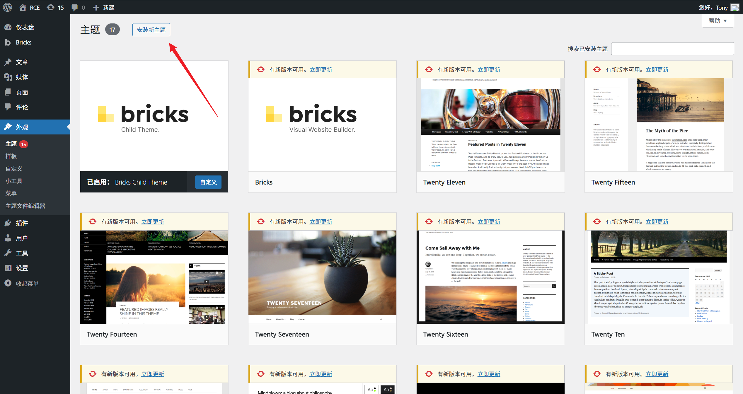 - 完成设置后登录,进入后台,点击 外观- 主题 – 安装主题。