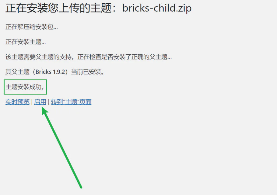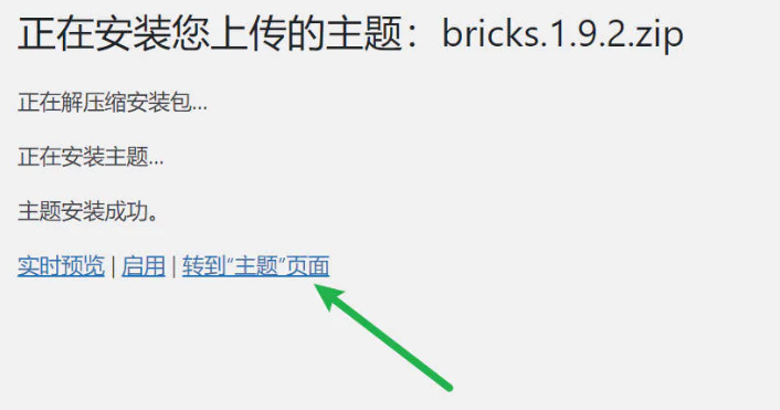 bricks1.x.x.zip的这个文件(==注意版本==),请注意安装完这个不要点启用。而是点击转到主题页面,继续安装子主题。