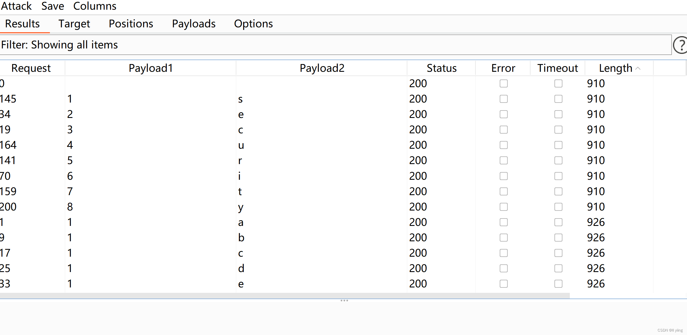 设置好字典以后就可以开始爆破了。爆破成功后排序就可以得到数据库名:security.
