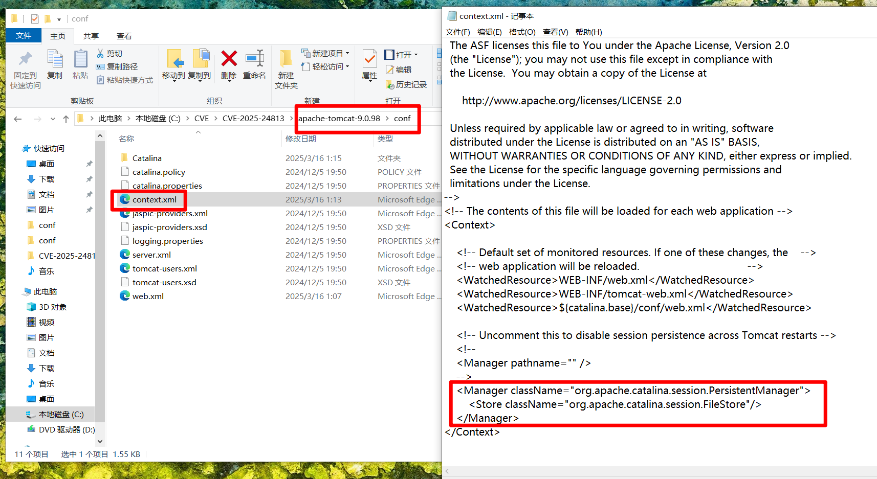 - 远程代码执行(RCE):结合 Tomcat 基于文件的 Session 持久化机制,利用反序列化漏洞执行恶意代码。