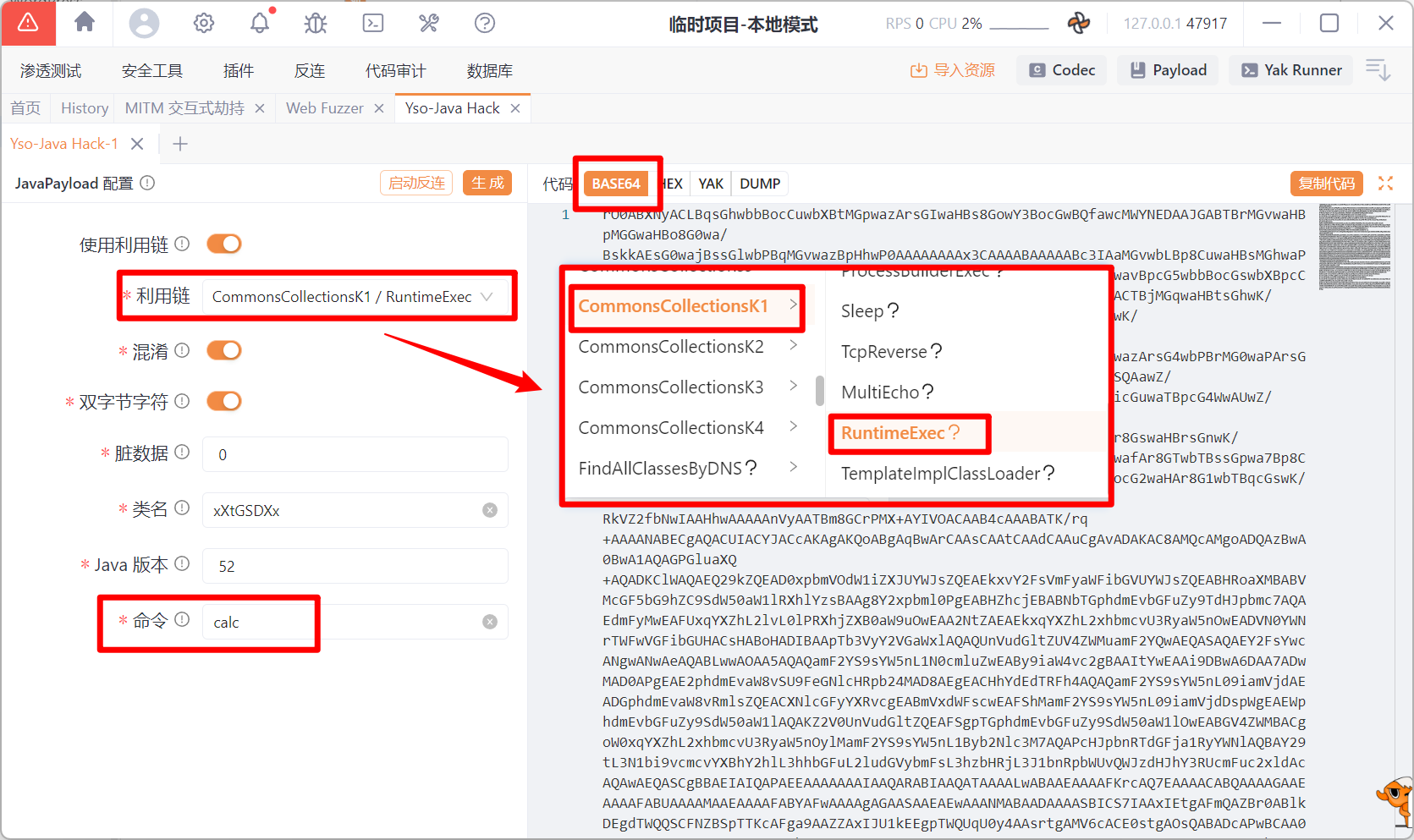 - 使用 yakit 中的 yso-java hack 生成一个 base64 的序列化利用链(当然,使用 Java Chains 或者 ysoserial.jar 也是可以的)。