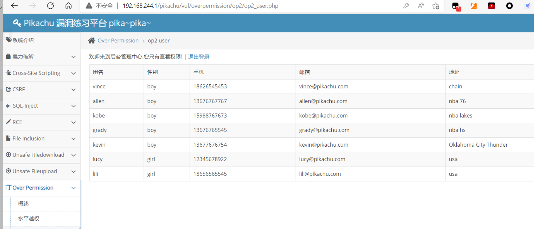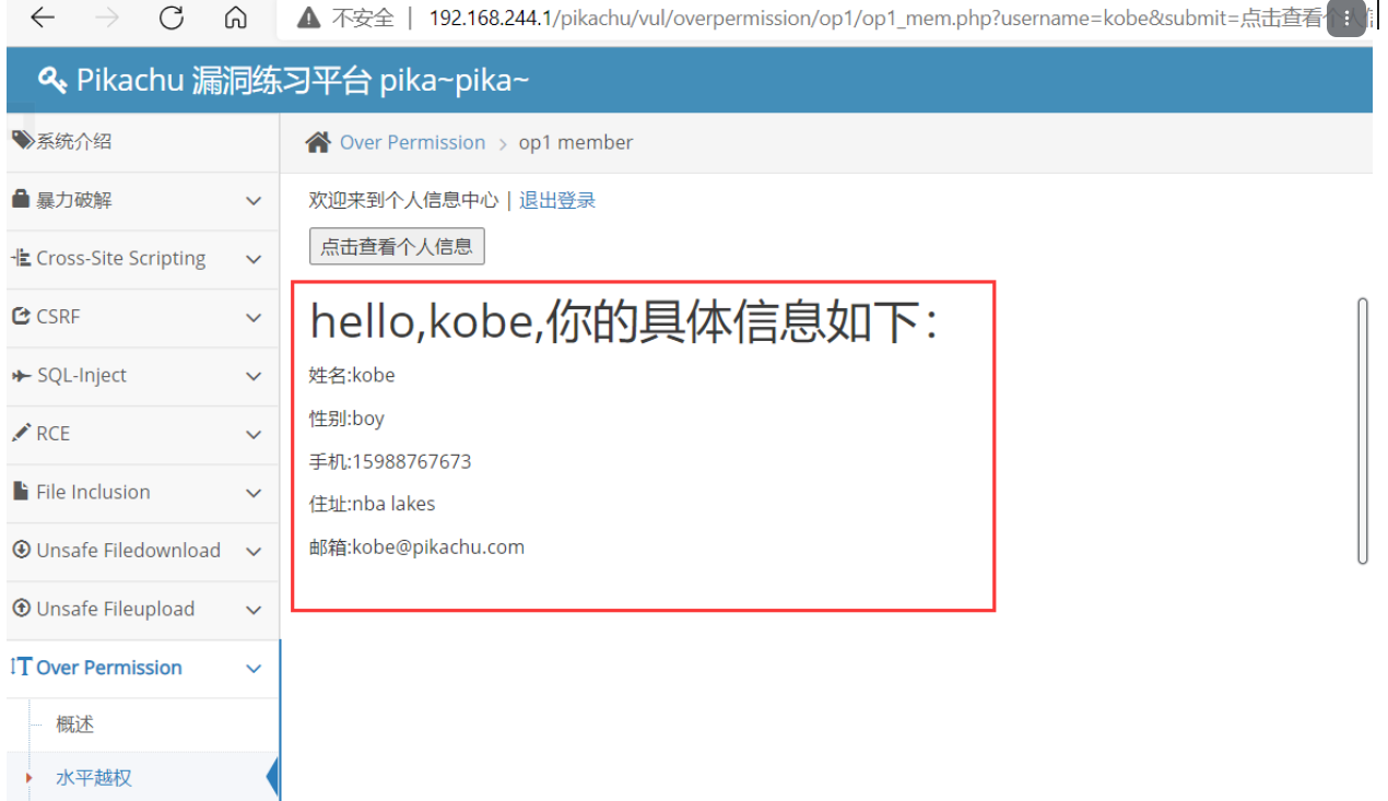 实验环境为 pikachu 靶场 over permission 模块水平越权