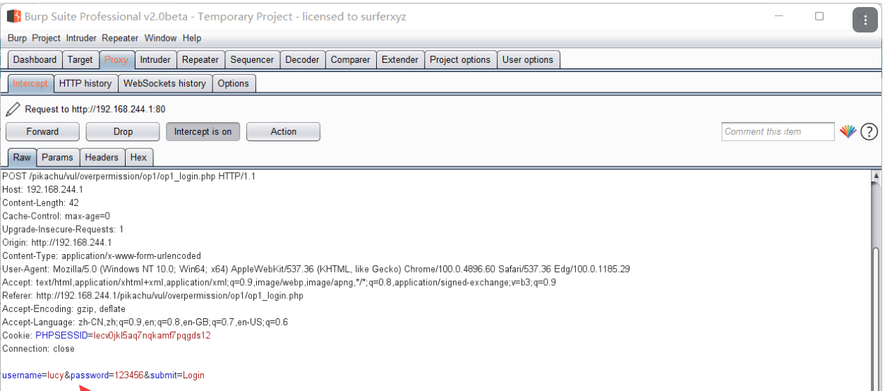 怎么实现水平越权呢?首先我们随便登录一个账号,比如 lucy,同时抓包,发现显示了 username & password