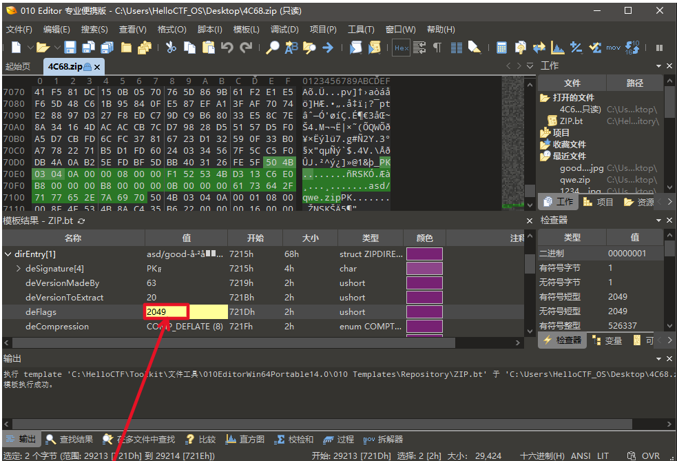 将此处的2049改为2048(原理为伪加密,将压缩包头部的第九位01改为00就能破解 )即可得到: