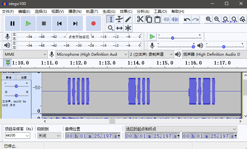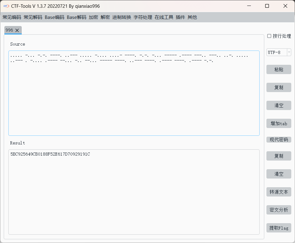 看到波形图如上,这是摩斯电码,相对细一点的是“.”,粗一点的是“-”,中间空段为空格,完整摩斯电码如下: