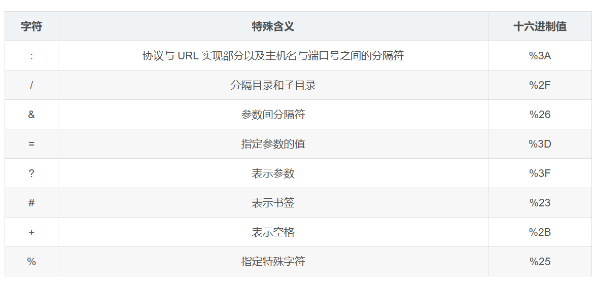 URL 的编码方式比较简单,即使用字符 % 后跟两个十六进制数字(0123456789ABCDEF 或 0123456789abcdef)表示字符码值的单个字节值。比如: