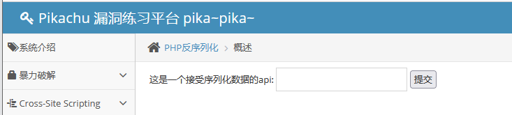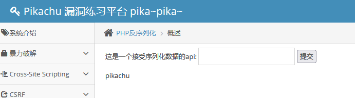 以下以pikachu靶场中一个简单的反序列化漏洞案例来说明: