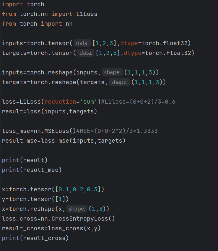 使用损失函数求平均绝对误差,均方误差,交叉熵损失