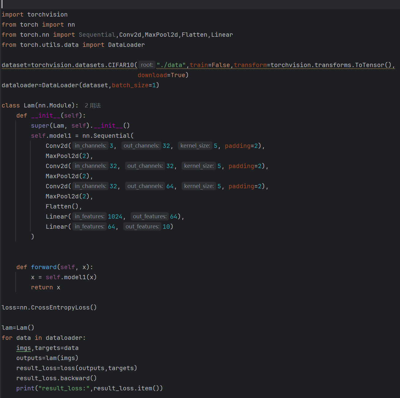 反向传播在CIFAR10中训练并打印每次迭代的损失值: