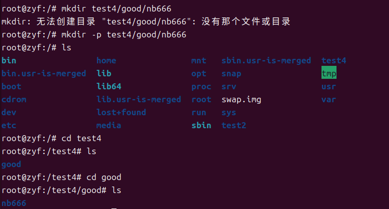 会报错,因为上级目录test4和good并不存在,所以无法创建nb666目录。