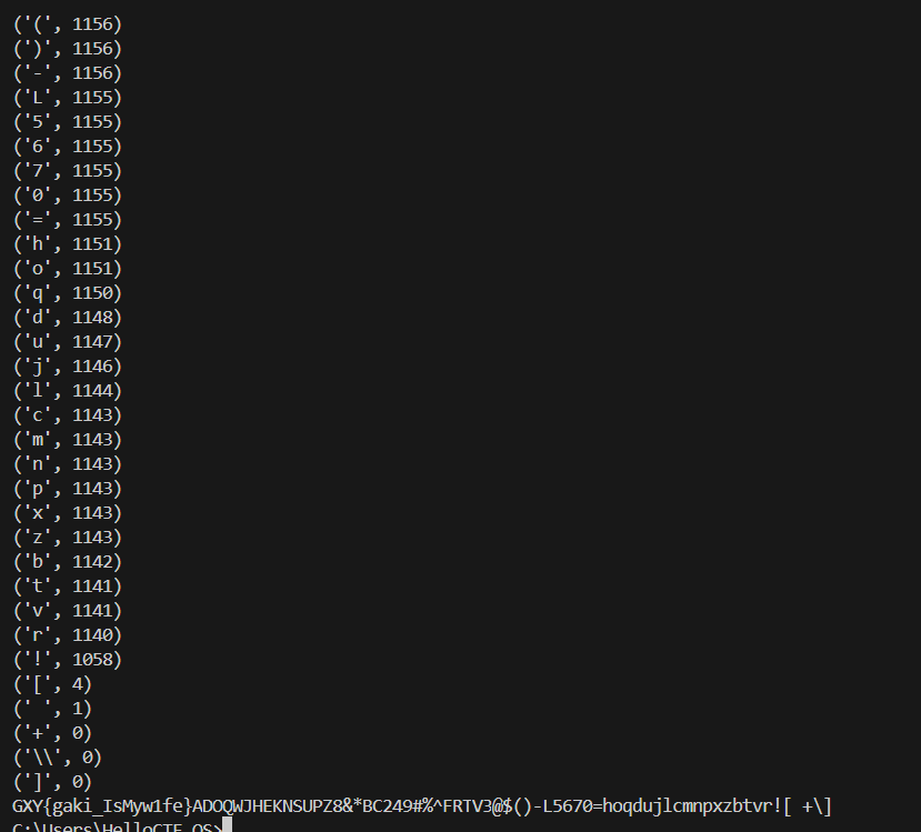 strings = open('C:/Users/HelloCTF_OS/Desktop/脚本\MISC/字频分析工具/flag.txt').read() #绝对路径