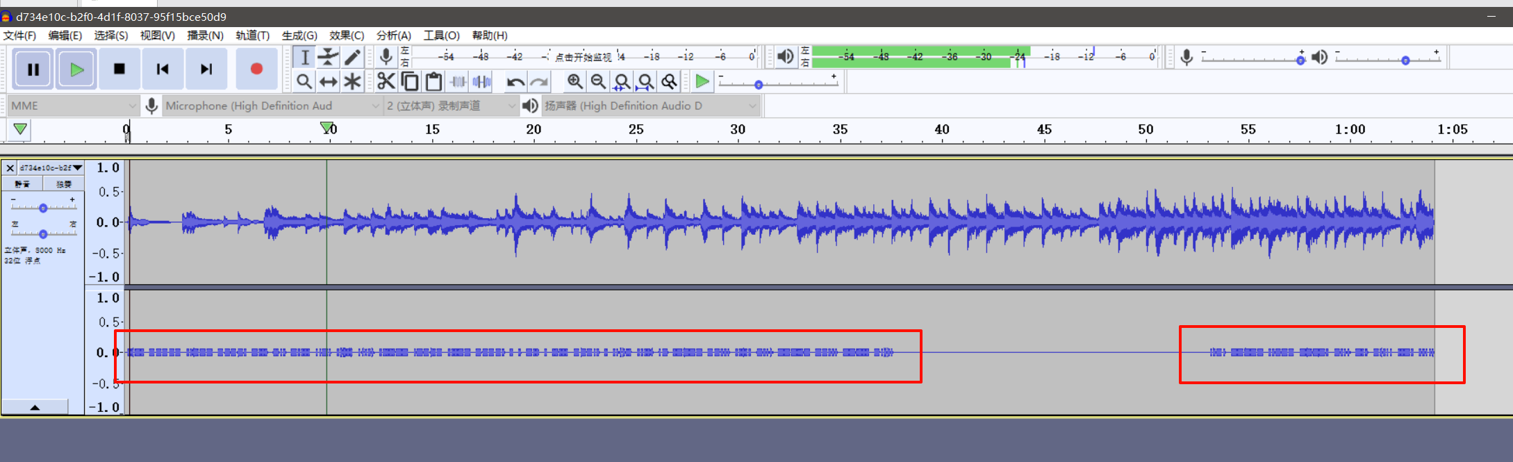 音频文件,放到Audacity看看。看到有两条音轨,放大下面的那条音轨,看到这一串音频,有很多分组,分组内由粗的音块和细的音块组成,类似莫尔斯电码的“-”和“.”,同时明显听出是摩斯密码