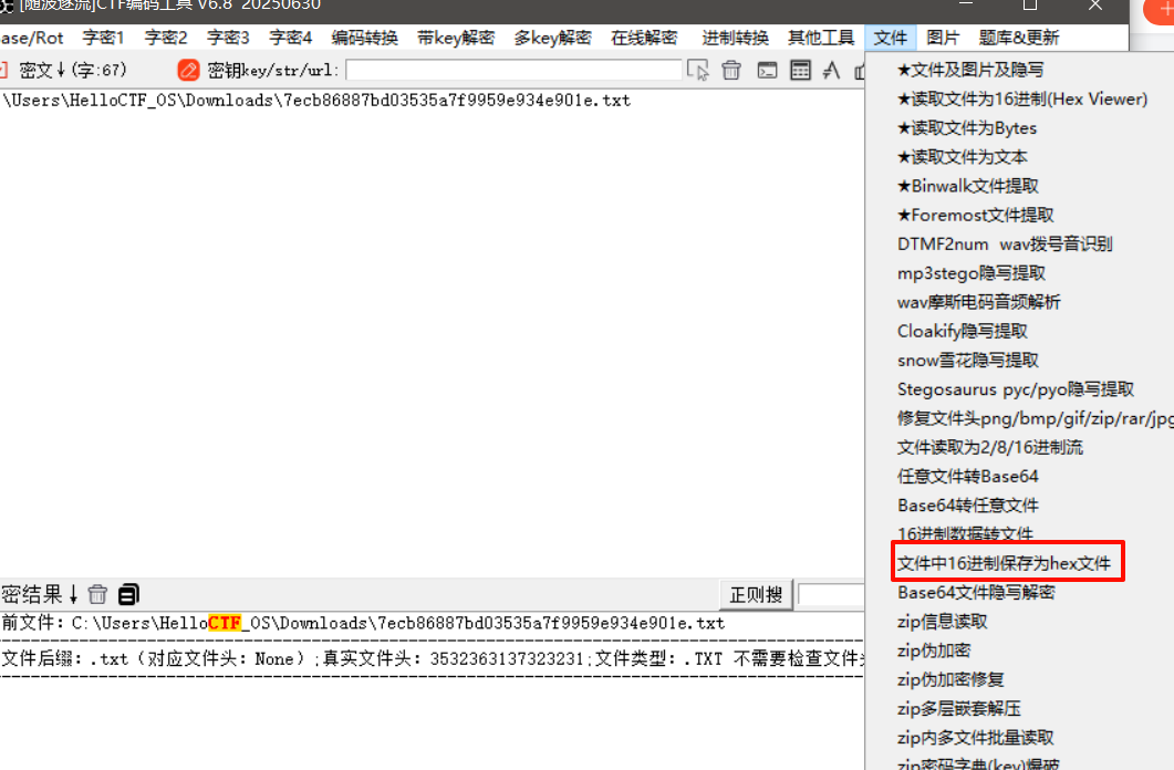 将txt放入随波,利用工具转hex,后缀改为rar