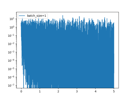 不难看出loss在剧烈震荡,因为每次都是只对一个样本点做计算,每一层的梯度都具有很高的随机性,而且需要很多运行的时间。