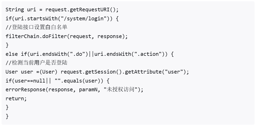 例如/system/login开头的接口是白名单,不需要进行访问控制(登陆页面所有人都可以访问),其他接⼝都需要