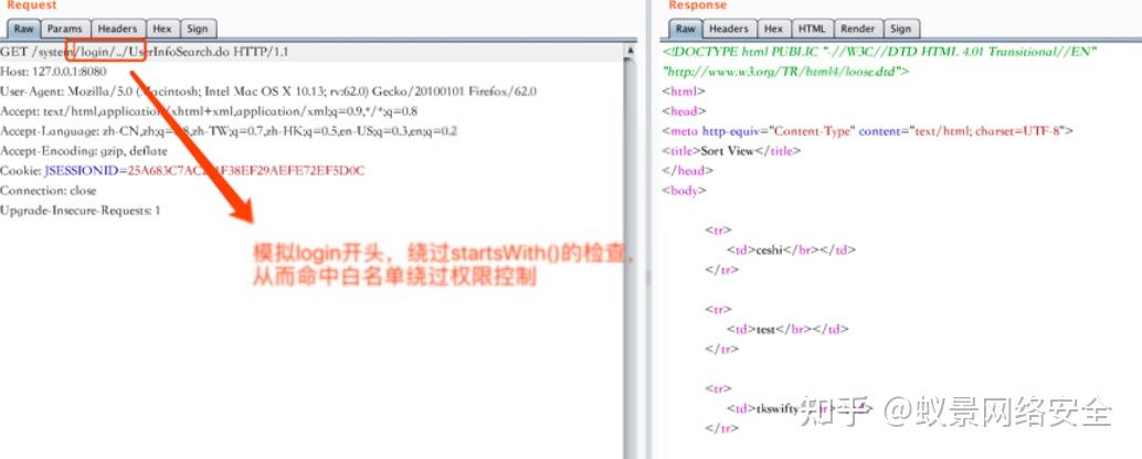 在URI引⼊入类似/login(白名单接口,可以通过测试得出,一般登陆都是不需要权限校验的)/../的样式,伪造⽩名单接口。
