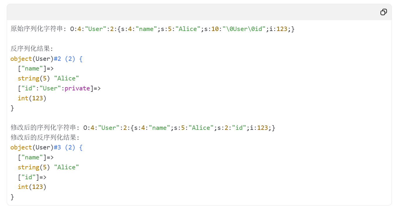 将需要进行反序列化的对象的序列化字符串中的成员数改为大于实际成员数即可。原理是:如果存在__wakeup方法,调用 unserilize() 方法前则先调用__wakeup方法,但是序列化字符串中表示对象属性个数的值大于真实的属性个数时会跳过__wakeup的执行