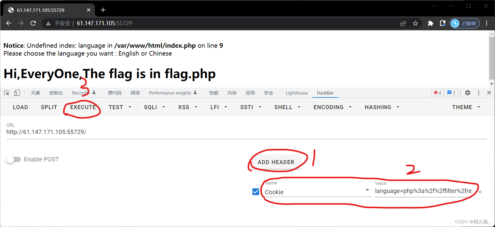 /resource=/var/www/html/flag填写flag.php所在的地址,本题在源码的第5行有提示地址为language in /var/www/html/index.php on line ;且需要注意注意源码第23行的内容(@include($lan.".php"); ),在上传参数时代码会附带后缀.php,所以此处不需要写为 '/var/www/html/flag.php'~