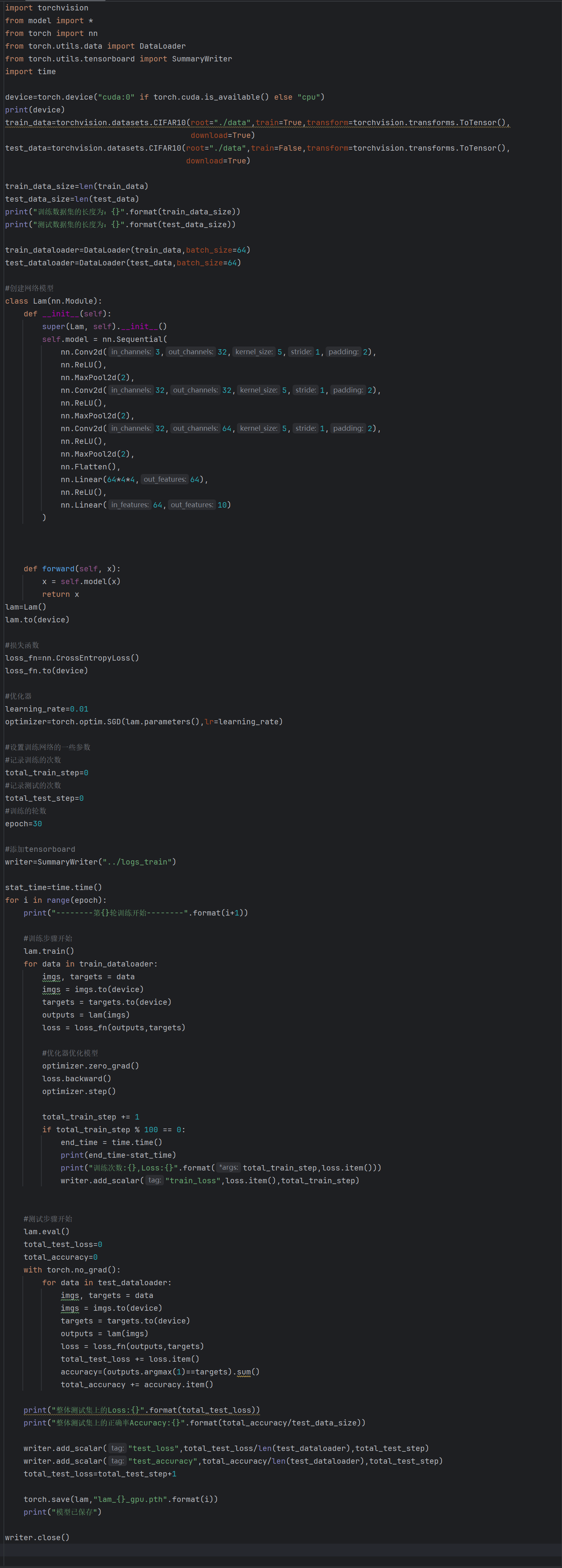 基于 Lam 模型,编写训练流程代码。加载 CIFAR10 数据集,用 torchvision.datasets.CIFAR10 获取训练集与测试集,通过 DataLoader 实现数据批量加载;配置损失函数为 CrossEntropyLoss、优化器为 SGD;设置训练轮次 epoch = 50 等参数,编写训练循环,在训练阶段开启模型 train 模式,逐批处理数据,计算损失、反向传播更新参数,定期输出训练日志;测试阶段切换模型 eval 模式,计算测试集损失与准确率,完整实现模型训练闭环 。