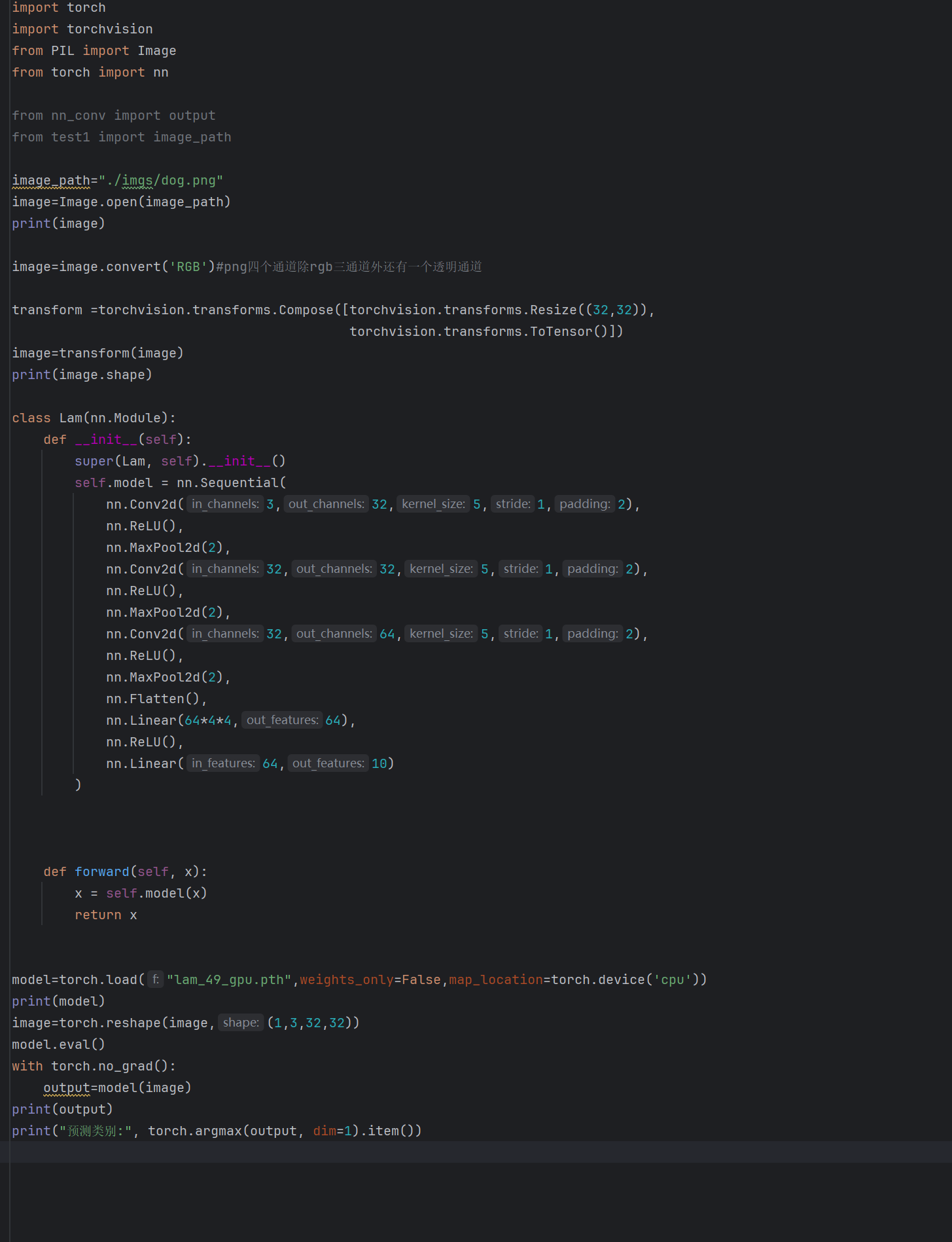 编写推理代码,加载训练好的模型(lam_49_gpu.pth ),处理输入图像(读取、转换通道、Resize、转 Tensor 等),通过 model.eval() 与 torch.no_grad() 保障推理阶段的稳定性,输出预测类别,验证模型实际应用时的推理能力 。
