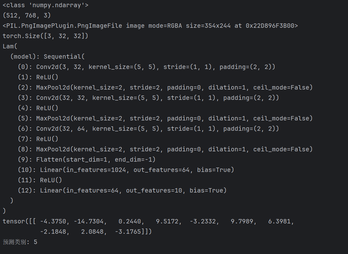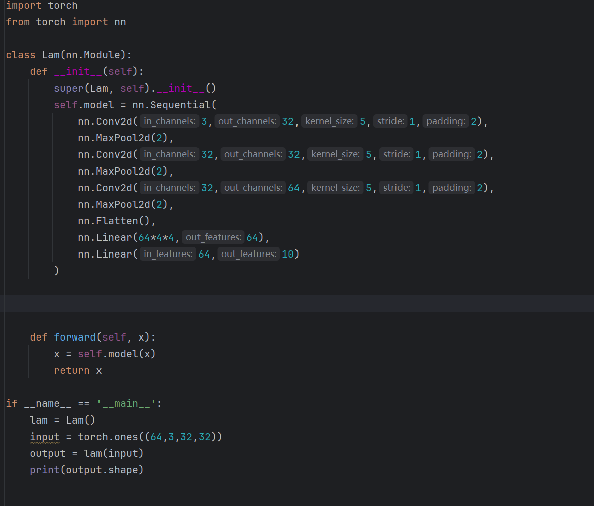 定义 Lam 神经网络类,继承 nn.Module,在 init 方法中通过 nn.Sequential 搭建卷积神经网络结构,包含多层 Conv2d 卷积、MaxPool2d 池化、Flatten 展平及 Linear 全连接层,实现从 3 通道图像输入到 10 分类输出的特征提取与映射;编写 forward 方法,完成正向传播逻辑,保障模型可接收输入并输出预测结果 。同时,编写 if name == 'main': 测试代码,用 torch.ones 生成模拟输入,验证模型前向计算时输出维度的合理性,确保模型结构无基础错误 。