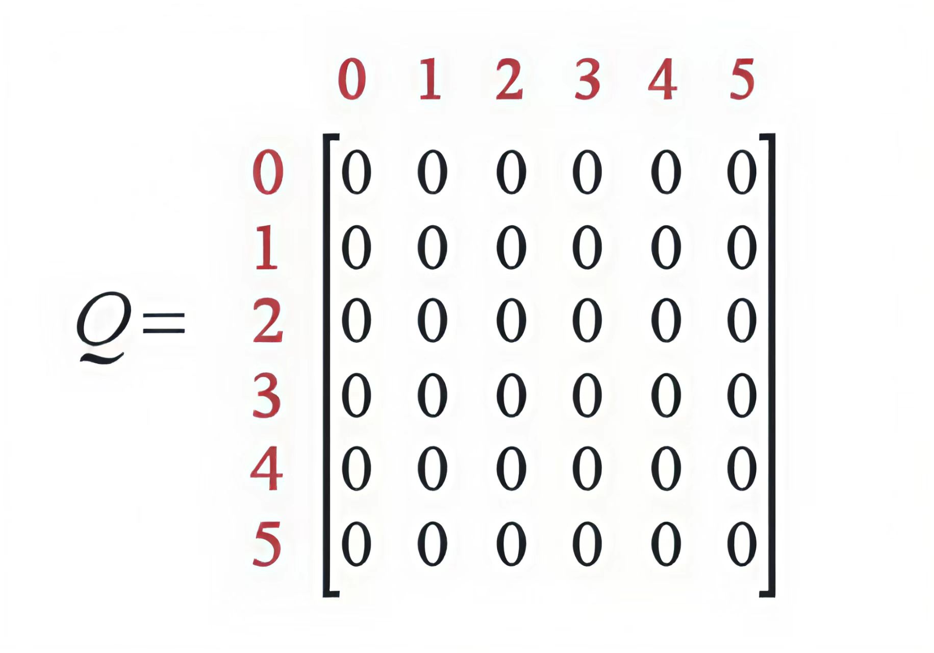 类似的,我们可以让Agent通过和环境的交互来不断学习环境中的知识,让智能体根据每个状态来估计每 种行动可能得到的收益,这个矩阵被称为Q表,每一行表示状态,每一列表示不同的动作,对于状态未 知的情景,我们可以随机让Agent从任何的位置出发,然后去探索新的环境来尽可能的得到所有的状态。刚开始Agent对于环境一无所知,所以数值全部初始化为0,如下