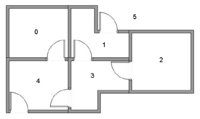 那么我们可以将其简化成一些节点和图的形式,每个房间作为一个节点,两个房间有门相连,就在两个节点之间连接成一条线,如图: