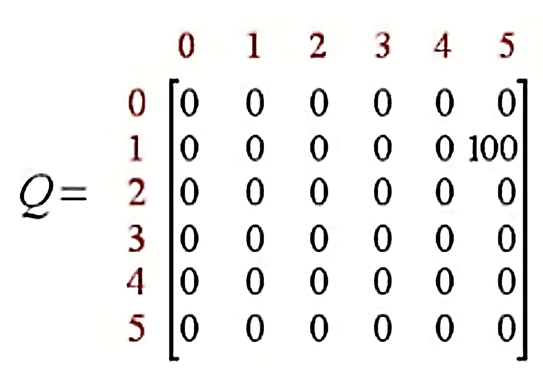 [Q(1,5)=R(1,5)+0.8max{ Q(5,1),Q(5,4),Q(5,5)} =100+0.8max{ 0,0,0} =100]