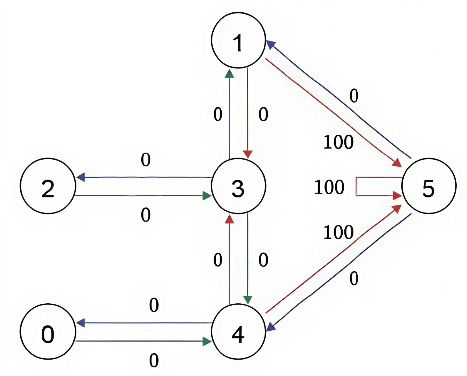 在模拟全过程之前先将Agent放置在任何一个房间,为了能够让Agent知道5号节点是目标房间,我们需要设置一些奖励,对于每一条边,我们都关联一个奖励值,如下图设直接连到目标房间的边的奖励值为100,其他边可以设置为0。需要注意的是,为了能让Agent选择一直待在5号房间,我们需要把5号房间指向自己的箭头的奖励值也设置为100,这样当Agent到达5号房间后就会一直呆在那里,这也称为吸收目标