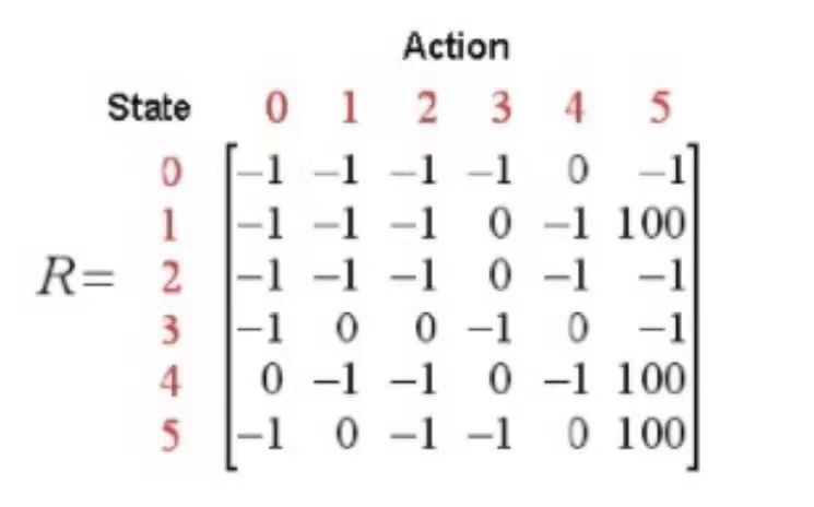 我们将每一个房间都称为一个状态,而Agent从一个房间走到另一个房间称为一个动作,对应上面的图就是每个节点是一个状态,每个箭头都是一种行动。假如Agent处在状态4,从状态4来看可以选择走到状态0或者状态3或者状态5,如果走到了状态3,也可以选择走到状态2或者状态1或者状态4。我们可以根据状态和动作得到的奖励来建立一个奖励表,用-1表示相应节点之间没有边相连,而没有到达终点的边的奖励记为0