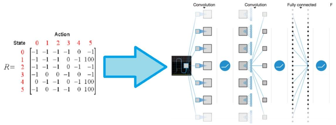 一个非常简单的办法就是使用深度学习来解决这个问题,所以出现了一种新的网络,叫做Deep Q-Networks,将Q-learning和神经网络结合在了一起,对于每一个state,我们都可以使用神经网络来计算对应动作的值,就不在需要建立一张表格,而且网络更新比表格更新更有效率,获取结果也更加高效。