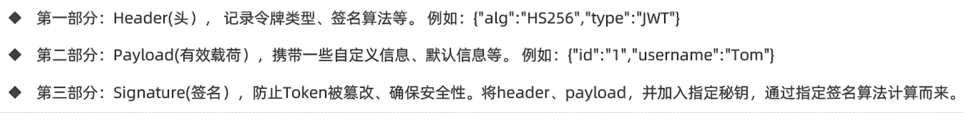Payload(载荷):包含了要传输的信息,比如用户的身份信息、权限等。