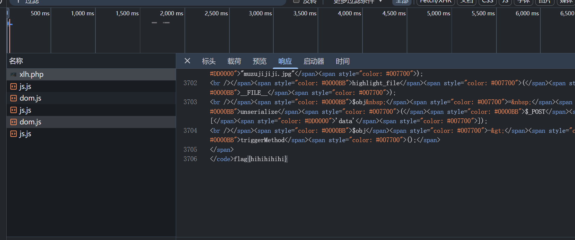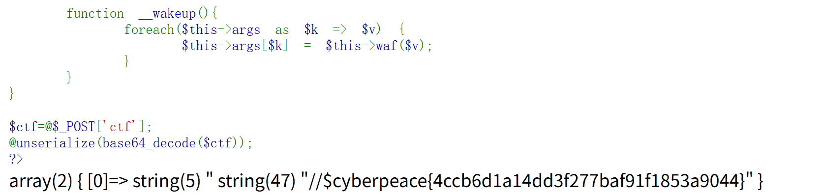 因为在反序列化的时候会触发__wakeup方法,其中又会调用waf方法,waf中存在正则if (!preg_match_all("/(\||&|;| |\/|cat|flag|tac|php|ls)/", $str, $pat_array))